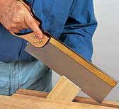 Cut 1 – Begin by cutting the workpiece at the far corner of the end. What may seem awkward at first becomes easier with practice. Extend the sawcut to the near side, making a kerf that’s parallel to the end and about 1/8″ deep. This kerf will guide the next cut.