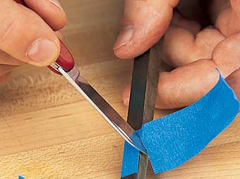 To know how deeply you are driving the chisel into the mortise, make a simple depth gauge using a piece of blue masking tape stuck to the back of the chisel and trimmed flush with the edges. Don’t wrap the tape around the chisel because it will crush and tear as you get to the final depth of the mortise and lever out the waste. For our purposes here, the tape also tells you which way the chisel is facing as you look at the photos of chopping the mortise.