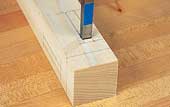 Use two hands to position the chisel exactly between the gauge lines that mark the side walls and parallel to the knife lines that mark the end walls. It’s difficult to locate the chisel accurately with a mallet in one hand. Next tap the chisel to set the edge into the workpiece. The importance of how the chisel width is measured should now be apparent. By using a top-of-the-spurs setting, the gauge line reflects the actual chisel width and makes it easier to position the chisel. A bottom-of-the-spurs setting makes the gauge lines wider than the chisel, making it difficult to repeatedly position the chisel in the right place.