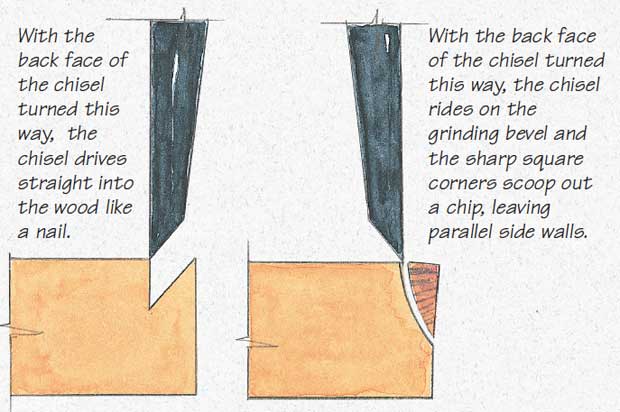 Both methods rely on the fact that the mortise chisel cuts the wood with the square corners of the back face and scoops out the waste by riding on the grinding bevel. To see how it works, get a block of wood — a 2 x 4 will do. Stand facing the end grain and position the chisel 1/4″ from the near end, with the back face away from you. Drive the chisel into the wood with a hard blow, like driving a nail. Now turn the chisel around and repeat the procedure. This time the chisel scoops out a chip as it rides on the grinding bevel. You just completed the essential steps for chopping a controlled square hole with a mortise chisel: you first made a space and then you scooped out the waste. I’ll now describe how to make that space for each of the chopping out methods.