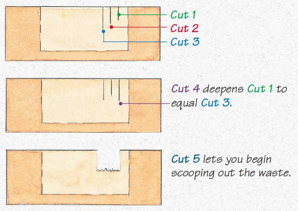 Cut 3 — Remove the chisel and position it another 3/16″ towards you for Cut 3, which will go deeper yet.