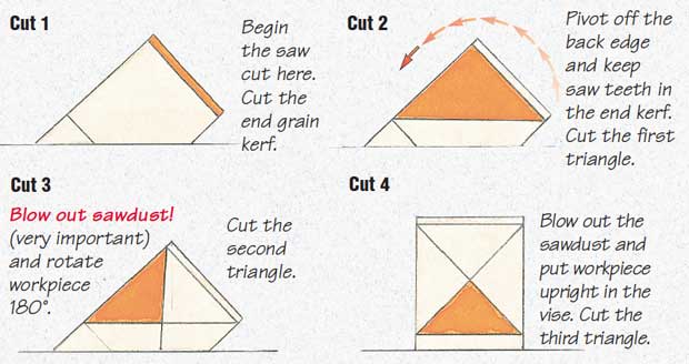 Cut 4 – Remove the workpiece, blow sawdust from the two kerfs, and clamp upright in the vise. Keep the tooth edge parallel to the benchtop as you saw down to the shoulder lines. You have now cut the third triangle.