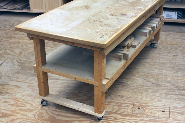 Chris Marshall: I completely agree with Tim’s logic, but I also know how expensive shop improvements like workbenches can be. So, while you won’t find this to be an attractive solution to your bench top, I’ll offer it anyway as a nod toward frugality: consider an MDF top. My first “real” woodworking bench was made with a framework of home-center 2x lumber and a doubled-up top made of 3/4-in. MDF (see below). I put a banding of 3/4-in. poplar all around its edges to hide them and improve durability (see top photo). Now, I know what you’re probably thinking: this was FAR from an attractive bench. But it was rock-solid, heavy enough to stay put and served me well for many, many years. Primarily I used it as a power tool bench, but it was big enough that I also could use it for general assembly and finishing tasks (the top was a full 4×8 ft.). The doubled-up MDF was dead flat, smooth and surprisingly durable — and at the time, I think I could buy two 4×8 sheets of it for under $40. I don’t think I spent $100 on the whole project.