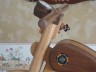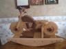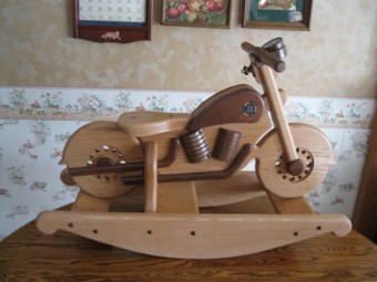 I designed this rocker by visiting a local Harley shop, and I picked up a few accessories to add to it, including the simulated speedometer, the key and the Harley logos inset in the tank. It is constructed with red oak and walnut. There were a few challenges involved in building it, such as the wheels, the handle bars and speedometer holder, and the heads. But I think it will withstand any abuse a toddler can throw at it.