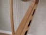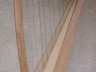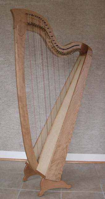 My first major woodworking project – a 34-string lever harp made of cherry with a 1/8″ birch 5-ply soundboard and a curved back to increase the interior volume of the soundbox. The column is laminated with two pieces of quarter-sawn cherry while the neck (curve) is three ply cherry with opposing grain direction. Each string has a sharping lever which raises the pitch one-half step when engaged. Red strings are “C” and blue strings are “F”. The pitch range is 4 3/4 octaves.