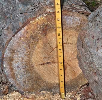 Finally, measure the diameter at the TOP of the log. Always measure diameter “inside bark” – meaning that you don’t want to capture the bark thickness in your measurement.