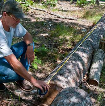 Measure the length of the log and round it down to the nearest even foot. For example, if you have a 15’3″ log, use the 14′ long length in the log rule table. Most loggers will cut logs into lengths only an inch or two greater than the nearest even foot. Remember that the butt of a log usually is not sawn flat, so measure the shorter side of the log for length.