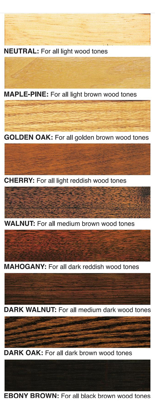 Evans says the unique formula contains “just the right amount of solvent blended with a small amount of stain and mineral oil.” And, the application process is simple: wipe the fluid on and wipe off the excess. Restor-A-Finish is formulated in nine wood-color shades to approximate the tones of most common furniture hardwoods, including maple/pine, oak, cherry, walnut, mahogany, and darker stained walnut or oak, plus an ebony brown.