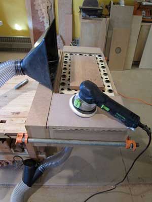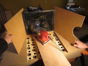 In the example of the downdraft cart, I had a really great idea of using a dust port at the bottom of the vacuum chamber and a dust hood at the back of the sanding area — both hooked up to a single dust collector. The only problem was that it sucked — or, actually, did not suck very well at all. So, we scratched that idea … We also had the concept of making wings that folded down to create a reduced area in which to sand smaller pieces — thus increasing the airflow around the small pieces and therefore collecting more sanding dust. This idea, like the previous one, bit the dust. (Sorry: puns are a weakness of mine).
