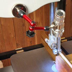 First, the 4-in.-long, solid aluminum flashlight body contains 14 “super bright” LEDs and is powered by three AAA batteries that are included. It mounts to a 7-1/4-in. aluminum arm that articulates at three joints which tighten with a single knob. A quick release clip holds the flashlight and the arm together. The base of the arm contains a focused magnet offering 40 lbs. of holding power, so you can attach it to any cast-iron or steel tool or work surface, including drill presses, band saws and table saws.