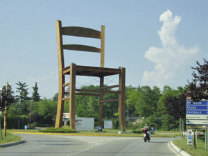 The next day, we left for Udine, a medium-sized town in northeastern Italy not far from the Slovenian border. After visiting Freud’s carbide plant and saw blade factory (no wood sightings there; just lots of metal and machinery), we drove through the municipality of Manzano, the self-proclaimed world capital of chair production. This achievement is celebrated by a surprising roadside attraction: a 100-foot-tall chair-shaped monument. But nowadays, there are only 800 chair factories in the area, down from 1,200 just a few years ago. The great majority of the companies are small or medium-sized and family-owned firms and that, at their peak, made 30 percent of all the chairs produced in the world!