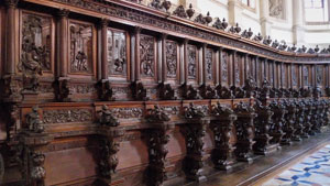 One of these watercraft took our Freud group across the grand canal to see the San Giorgio Maggiore, a grand 16th century Benedictine church on the island of the same name. Designed by the famous Roman architect Andrea Palladio and built between 1566 and 1610, the church’s brilliant white marble façade embodies classical renaissance style. It simply gleams above the blue-green waters that surround it. Inside the church, behind the altar and presbytery (the area reserved for the clergy), is the monk’s choir, a room with walls lined with carved wood stalls and seats for the Benedictine monks. Above the stalls, richly carved panels depict religious scenes and create an elegant counterpoint to the stone columns, capitals, and statues seen throughout the church.