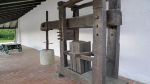 Later in my Italian adventure, our Freud group visited a couple of wineries in the Friuli region of northeastern Italy, famous both as a manufacturing center and as a world-class wine region. The area was simply lovely: endless verdant rolling hills (most covered with well-tended grape vines), with breathtaking views of the snow-capped Alps in the distance. After tasting delicate Sauvignons and Pinot Blancs at the Russiz Superiore winery and touring their impressive cellars, I got another unexpected “wood fix”: They had an ancient wine press on display in front of the tank shed (where the wine is fermented before being put in barrels for aging).  Although no one could tell me exactly how old this press was, or even when it had been retired from service, its heavy hand hewn oak beams, handcarved screw and huge dovetail joints were a delight to behold.
