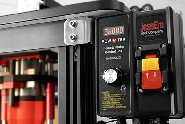 JessEm’s Pow-R-Tek™ Router is a 15 amp, 3-1/4 peak hp motor with soft start and electronic variable speed control that ranges from 10,000 to 21,000 rpm — suitable for heavy-duty router table use. But what makes this motor unique is that it is tethered by a 5-1/2-ft. cable to a remote control power box that can be mounted to your router table wherever it’s convenient. No more reaching under the table to turn the motor on off or to make speed changes. A large adjustment knob dials the motor’s speed up or down, and you can monitor it on a digital, easy-to-read display.