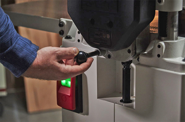 A 3hp, single-phase, 230-volt motor with V-belt transmission drives each machine to reduce vibration and running noise. They are controlled by an easy-to-access magnetic switch, which has a green safety light that illuminates when the planer is powered.