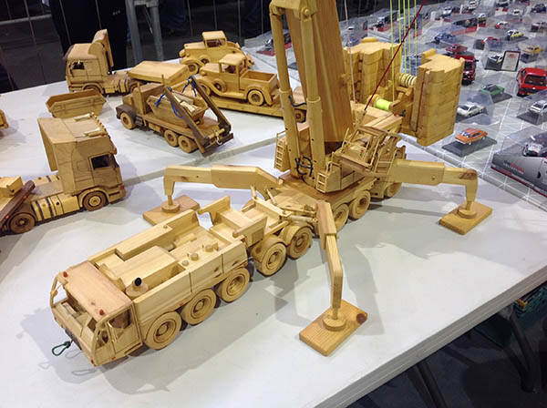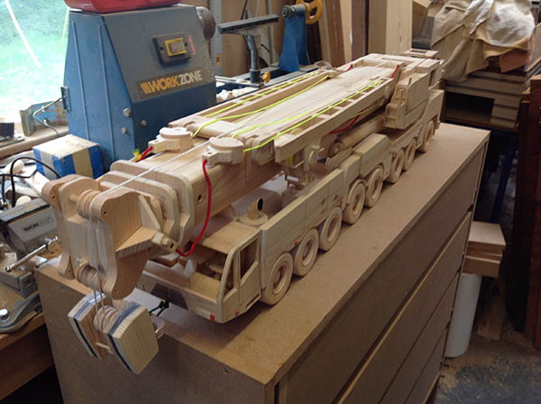 John had learned the skills to do woodworking with a high degree of accuracy in his work as a carpenter/joiner, especially when he worked in London on projects that included the restoration of buildings dating back to the 14th century. He has applied those skills of accuracy to his models, which are now all replicas of real vehicles: trucks, cranes, excavators, etc.