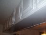 Wife complained of lack of storage for kitchen and dining room utensils etc. Couldn’t find any ready made cabinets to fit the structure beam between DR and kitchen so built them myself. Designed so final install would be enclosed not to show beam ever existed. Five units at 32-1/16″ ea. with two doors each. Insides pre-drilled for adjustable shelves. Primed and sprayed with 5 coats of Dutch Boy brilliant white semi gloss. Face frames are doweled and installed to MDF shells with biscuits.
