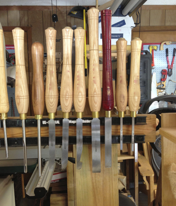 This handy rack will keep your lathe tools stored super handy but out of the way. Use two or, if you have several tools, use four of the 18″ magnetic bars. You will need about 10 feet of 1 X 4. And last you will need some 1-1/4″ wood screws. Mount the magnetic bars end to end on one piece of 30″ 1 X 4. Remember to glue then screw. These will attach horizontally on the next step. Cut 2 pieces of 1 x 4 as vertical supports attached to the back of the horizontal pieces. I attached the whole system to my lathe table. It took about 2 hours. Works great and you can make yours look even better if you router the edges and countersink the screws and fill and sand with wood filler.