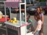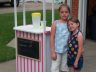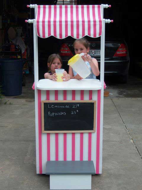 I found the striped sail cloth at the fabric store, made the canopy, then went to the paint store and matched the paint to the fabric, added wheels to the bottom, so they could move it easily out to the street. My son added the step on the front that screws on to make sure it doesn’t tip over. I also made a chalk board for the front and put it on with cup hooks so they could display the price. I painted a 1/4 ” piece of plywood with chalk paint and made a frame for it. I filled the cabinet with cups, straws, sugar, lemons, pitcher etc. and of course a money box. They loved it and every time they take it out to sell lemonade someone wants to know where they can buy one just like it. – Janet Little