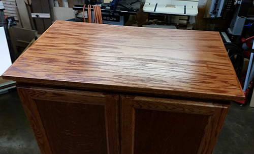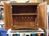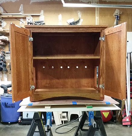 It’s made from red oak and red oak veneered plywood with quarter sawn white oak book-matched door panels.