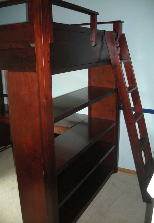 I built this double bed size loft bed with desk and bookcases for my grandson. It is made of maple and uses various hardware bought from Rockler. It was based on a picture in a furniture catalog.
