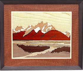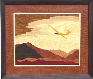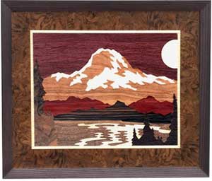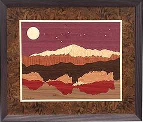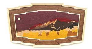 Lynne’s landscapes incorporate both day and night scenes. For the nighttime visions, she has a computer program that allows her to input real star patterns. She creates the intarsia constellations with brass disks she’s punched out of sheeting.