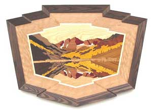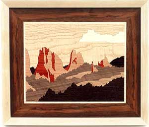 She also makes panorama scenes, which is her current favorite project to work on. “It’s a larger project, and the frame is stepped, more shaped – I do the framing and enjoy that part of woodworking as well,” Lynne said. “I prefer doing a bigger project. My scroll saw only has a 16″ throat, so to cut larger pieces is more of a challenge, and more rewarding as well.”