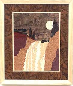 Back then, it was a challenge to find the woods she wanted to create her images, since there was no such thing as Internet shopping, and the appearance could vary so much from log to log. “I’d have to call and say, ‘I’m looking for walnut, and burled, and highly figured…'” she explained. She does not use dyes, stains, or fillers in her pieces, which are all created from veneers. Nowadays, Lynne can go online and look for specific pieces of specific types of wood, of specific colors.
