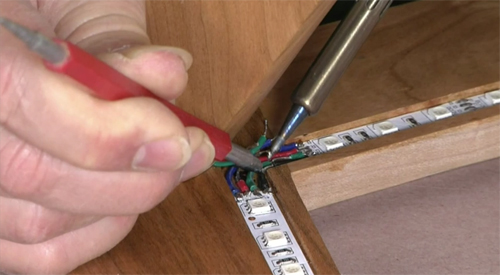 Coffee Table with LED Lighting: Sandor Nagyszalanczy adds an additional element of fun to a mid-century modern styled coffee table with the installation of color-changing LED lights beneath the glass top.