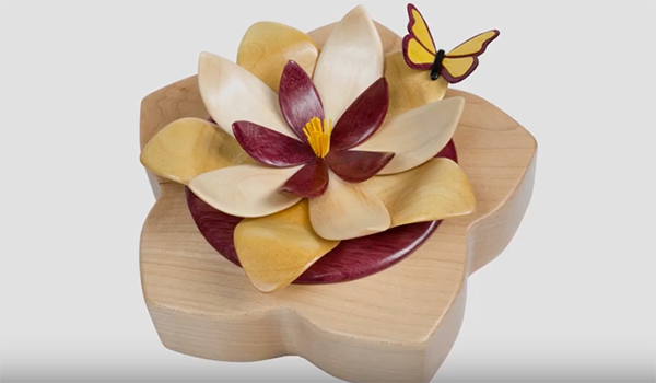 Compound Cut Flower Box: Scroll saw expert Carole Rothman creates a spring-themed box filled with flowers and butterflies, which also teaches techniques like stack cutting, creating contours – and how to make a round lid liner with matching grain on all of its edges.