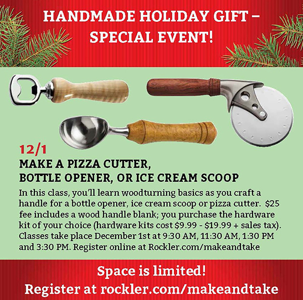 That’s why for “National Make a Gift Day,” which is this Saturday, Dec. 1, Rockler’s 37 retail stores are hosting Handmade Gift Classes. Participants will use a lathe and other tools to create a unique handle for their choice of a bottle opener, ice cream scoop or a pizza cutter, resulting in a one-of-a-kind handmade gift.