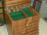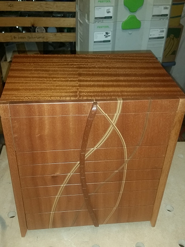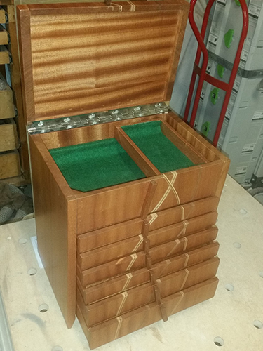 My wife was looking for a way to organize all of her make-up and brushes. She asked me if I would be able to build something for her. This is what I came up with. It is constructed from quartersawn sapele with light and dark strips of walnut for accent on the face. There are 6 drawers in varying heights that have box joints on the ends of the drawers. The lid opens to reveal a velvet lined space where she can store her watches and also contains a small removable box to house earrings and other small jewelry. The underside of the lid will have a mirror installed (not show in photos) to aid in applying her make-up.