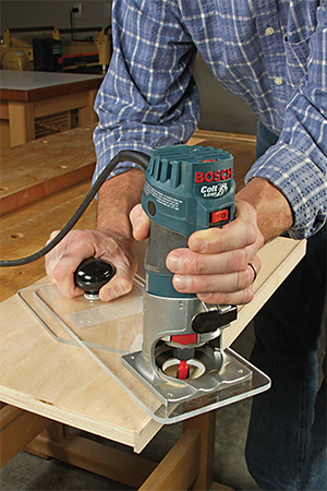 It’s made of plastic, and the tapered end is fashioned to an angle less than 90˚ so this spacer will fit even better into corners. To use it, I set a short straight bit or dish-carving bit (shown here) just shy of the work surface. Then, sweeping the jig over the protruding edge banding, dowel, etc., trims it neatly flush.