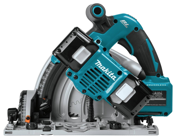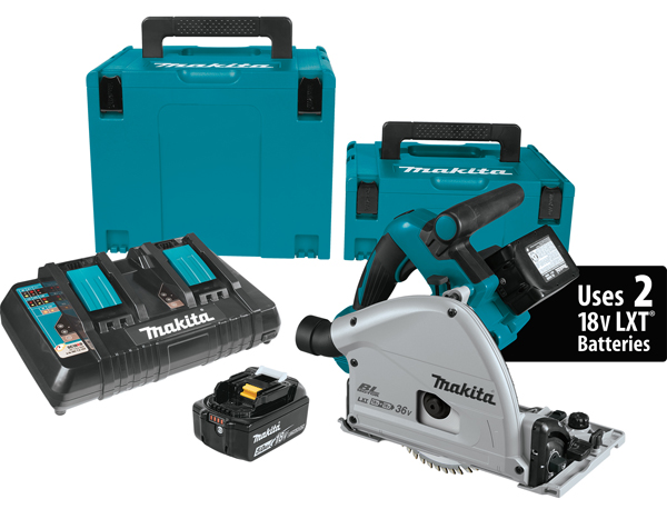 Makita’s 18V X2 (36V) LXT Brushless 6-1/2” Plunge Circular Saw Kit (model XPS01PTJ) includes two 18V LXT® 5.0Ah batteries, a rapid charger and two hard carry cases. It sells for around $656 without guide rails. Or you can buy the saw as a bare tool without batteries for about $422.