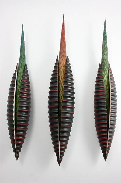 Her study of furniture making does continue to have an impact on her work, though, including both how she makes her pieces and her choice of materials. For her multi-piece assemblages, “There’s a real emphasis on making sure they’re put together well. It’s more of an additive process than a subtractive process: I don’t take a big chunk of wood and then carve it away until it’s what I want it to be; I take many small pieces, shape them, and then add them to each other to get a larger sculpture. I think that’s definitely more from a furniture making background than a sculpture background.”