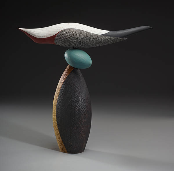 In addition to paint, the surface embellishments she applies to a piece might include carving or adding textures with a woodburning tool. That’s an aspect of the work that her husband, woodturner Graeme Priddle, also contributes to. “We work collaboratively a lot, and we teach collaboratively, so he handles the woodturning and then we both do the surface embellishing and stuff like that.” (The two will be teaching a class together on woodturning and surface embellishment at the Florida School of Woodwork in February 2019.)