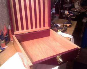 I made this memory box for my son. It is 16″ x 16″ x 5″ deep. It is made with White oak and Purple heart woods. He really likes Texas A&M. My first attempt at dovetails.