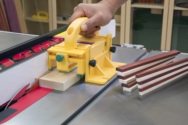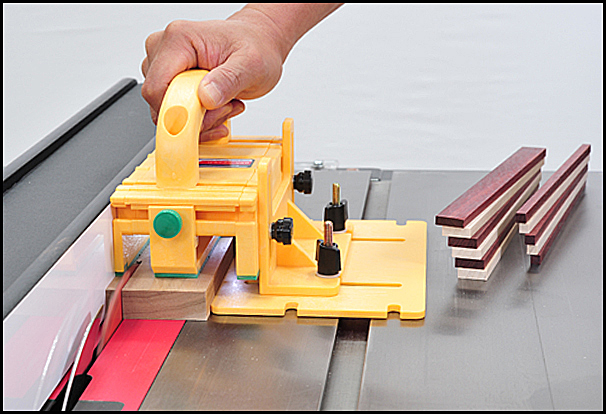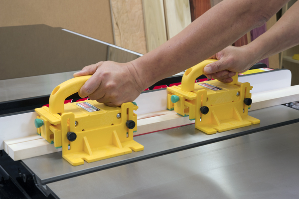 The company’s GRR-RiPPER®, which Wang’s father invented in 2001 when he founded the company, addresses the two most pressing and dangerous aspects of using a table saw: finger amputation and kickback. You’ve no doubt seen GRR-RIPPER advertised and used in publications and online for many years. It’s a plastic and rubber handheld pushing device that straddles the blade and controls both the keeper piece and the offcut during rip cuts. Wang points out that the device effectively controls the three vectors of force required to feed material through a table saw: it provides downward pressure against the saw table, inward pressure against the rip fence (during rip and groove cuts) and forward pressure to advance the workpiece. GRR-RIPPER’s raised handle design also keeps the “feed” hand shielded from the blade.
