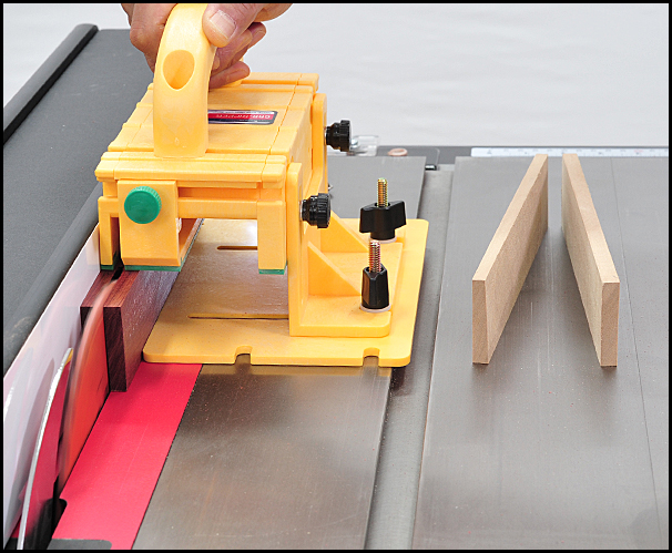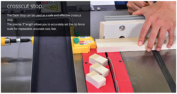 Another more recent safety product — Micro Jig’s MATCHFIT™ Dado Stop — is an indexed stop block that provides clear space between the rip fence and the blade for cutting dadoes or making through cuts. During a crosscut, Dado Stop enables an offcut to fall away from the blade instead of binding between the rip fence and blade, where it can jam, catch the blade teeth and be propelled backward violently.