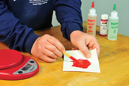 Replacing some of System Part A with color paste is one way to color epoxy. The next step is to add an equal amount of Part B to the colored Part A. A scale helps you be exact.