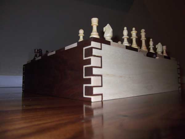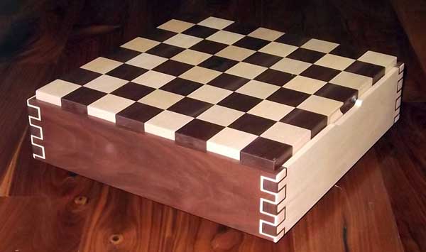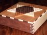 This is my first game board. I was given complete creative design on this chinese checkers. It was also my first attempt at a double-double box joint and also veneering. I am really excited at how it turned out. I used walnut, maple, cherry, and oak. It was finished with 6 coats of hand rubbed polyurethane with sandings between every other coat.