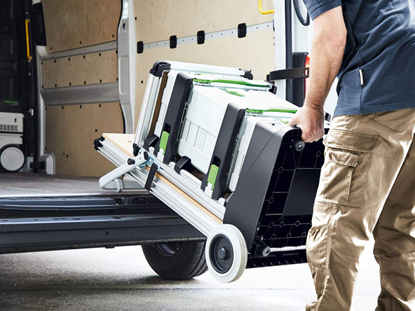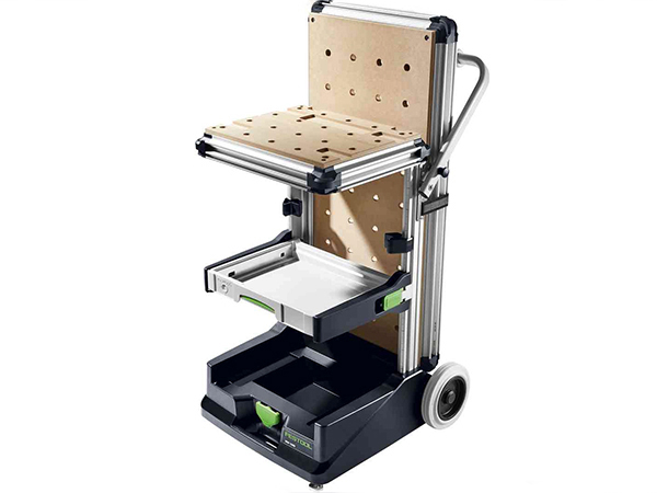 Festool offers two Mobile Workshop systems. The MW 1000 Basic (item 203454) includes the Cart and one pull-out Drawer for $500. The MW 1000 (item 203802) provides the Extension Table with the Cart and pull-out Drawer for $650. Additional Drawers (item SYS-AZ-MW 1000) can be purchased for $80. The worktop Base (item 203457) is available separately for $250 and is also compatible with Festool’s MFT Table.