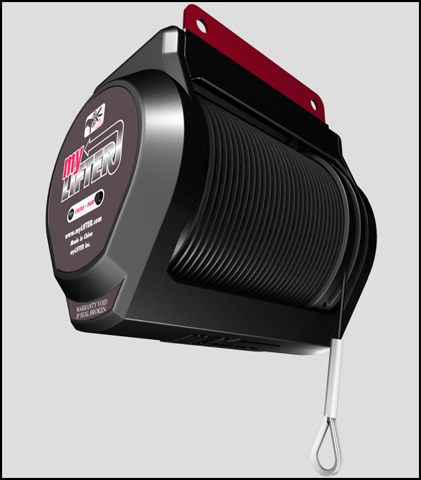 MYLIFTER is a DC-powered electric motor that weighs about 3 lbs. and can fit in the palm of a hand. It mounts to a steel track that attaches to the ceiling joists of a garage or other storage area. It can deadlift up to 50 lbs. using its steel cable or as much as 100 lbs. when used with pulleys and an additional steel track.