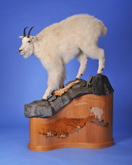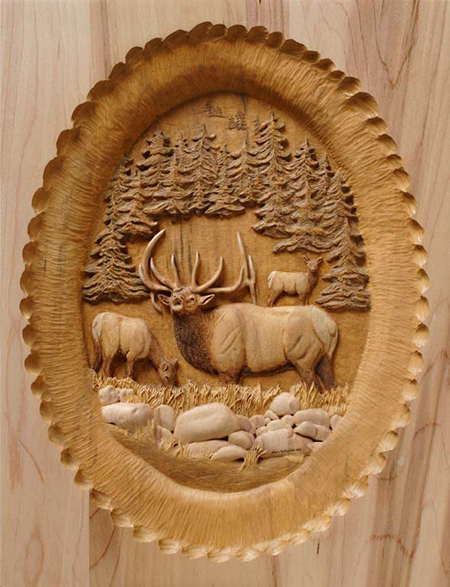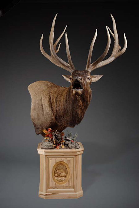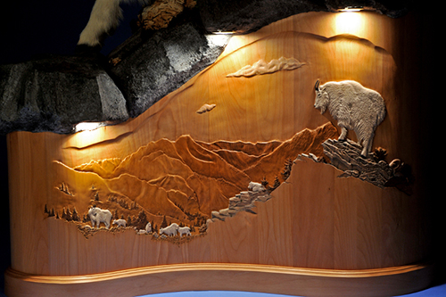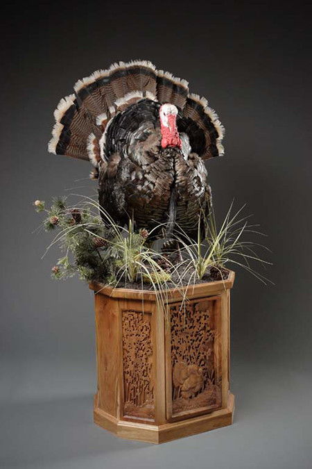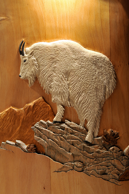 Included in the pictures you will find, the goat pedestal “Above Tree Line” and a few close up of that project, the Elk Pedestal “Broken Silence” with a close up of the carving as well, and the Turkey pedestal cabinet.  The face of the Turkey Pedestal is an actual door.