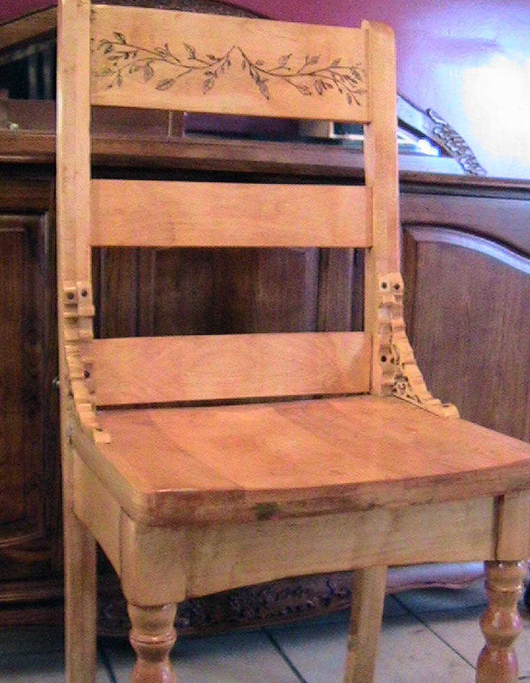 The other is a chair I made of maple of my own design. I turned the front legs and added the scrollwork on the seat sides. All mortise and tenon joinery. I also burned the flowers into the top back support. The seat started out 2 inches thick, I used a Lancelot to hog out most of the hollow for the curves of the seat. Thanks for looking.