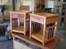These are two night stands I built for my sister’s guest bedroom. I used the plans from the February 2002 issue of Woodworker’s Journal and modified them to meet my desire for cleaner lines (no through mortises). I thought the purple heart contrasted nicely with the red oak which has a golden oak stain. I finished them with three coats of wipe-on poly.