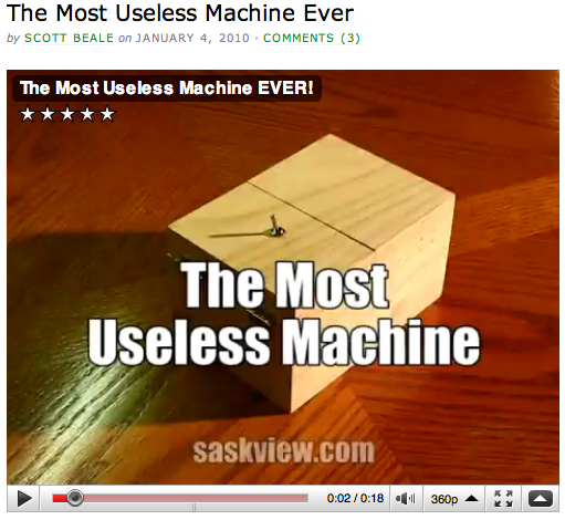 “The Most Useless Machine.” Gotta love that! Wouldn’t this little project be a kick to give to a kid? Heck, I’d be amused having it sit on my desk, too. Pure tomfoolery, and built to be nothing more than that.