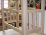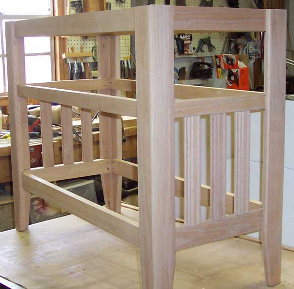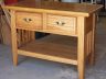 This is what I call an “entrance table” as that is what the friend I built it for wanted. It is made, entirely, of 3/4 inch oak sawn from an old solid oak church pew. It is all of glue and screw construction. The bars between the upper section and the lower shelf are set in with mortise and tennon construction. The legs are two pieces mitered and glued with all exposed edges rounded with a 3/8 inch round over router bit. All braces and spreaders are rabbited in place.