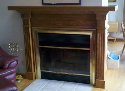 Custom fireplace mantle that wrapped around a corner. Project made from reclaimed oak from a church renovation.