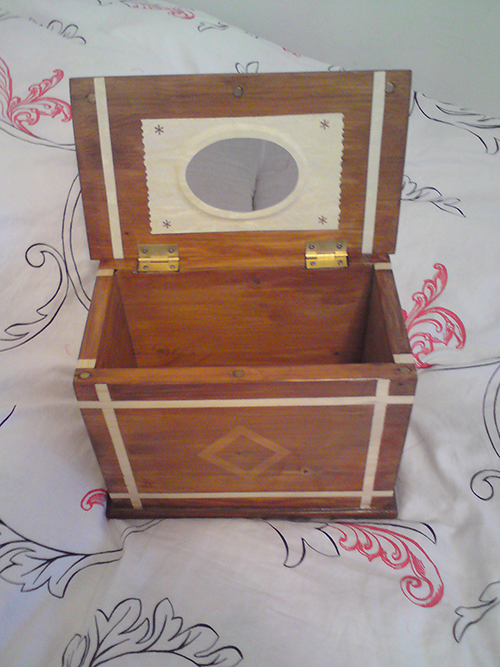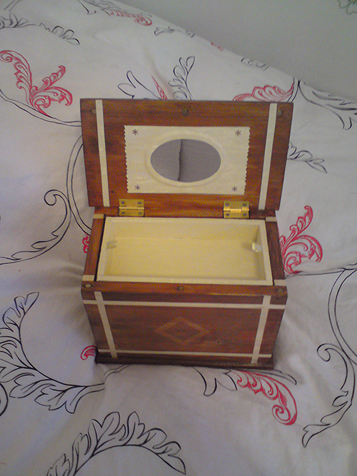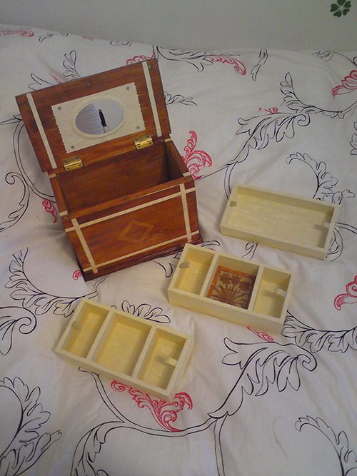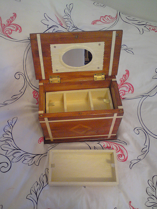 This is a jewelry box that I’ve made for my mom for Christmas. It is made with a dark oak varnish.